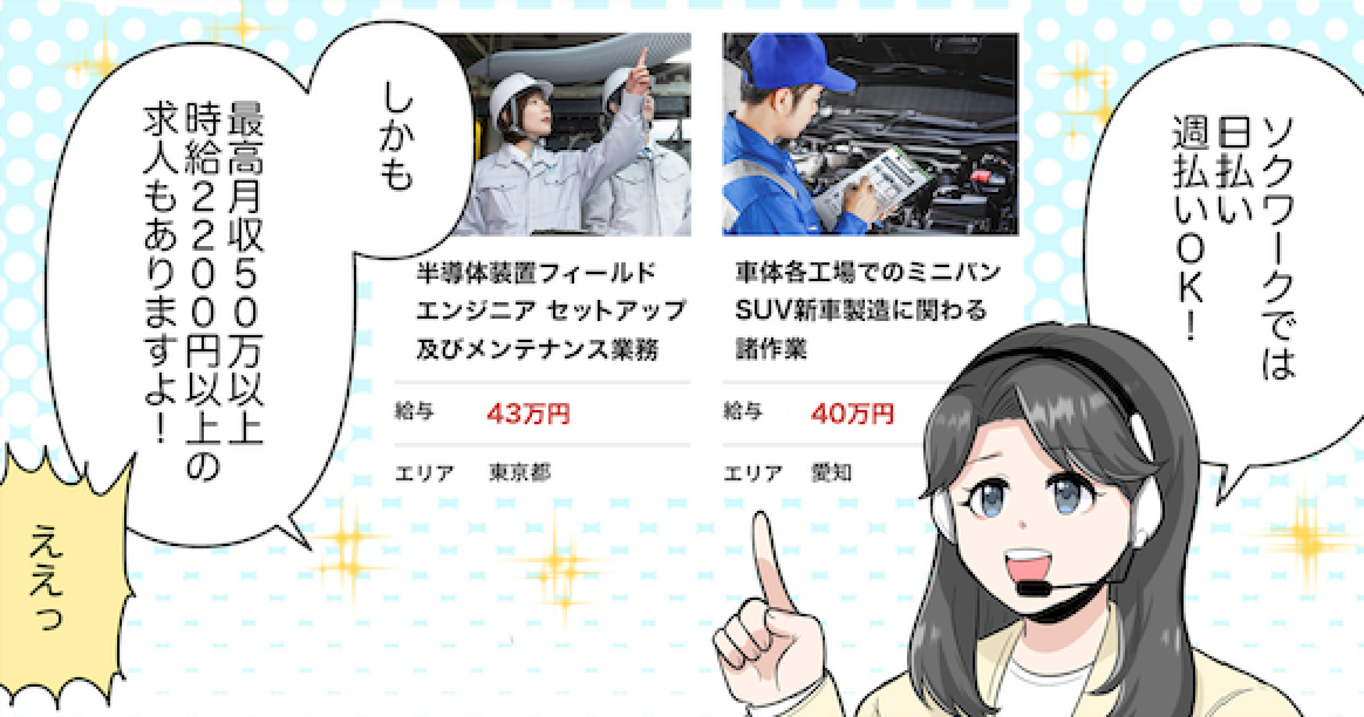 - ソクワークなら、独自の審査がありますが、審査に通れば入社までの生活サポートがあるため、所持金0円でも問題ありません。